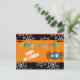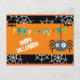 A frente deste cartão-postal de saudação de Halloween apresenta uma aranha preta fofa pendurada na sua teia contra um fundo laranja brilhante. O lado esquerdo contém texto branco que pode ser personalizado. Um banner "Trick or Tratat" é transportado por dois morcegos pretos. Uma borda de aranha negra e branca adiciona um interesse assustador. A parte de trás do cartão tem um campo para o seu próprio texto. Uma maneira barata e divertida de enviar saudações de Halloween! *O Clip art usado neste design é protegido por direitos autorais pela Encore Software, Inc., que permite o uso a seus licenciadores. Todos os direitos reservados.