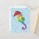Um divertido design de verão e praia apresenta uma ilustração vintage do cavalo marinho colorida com tons arco-íris.