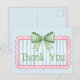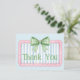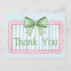 Este lindo cartão de agradecimento apresenta uma moldura rosa com listras azuis e brancas e encimado por um laço xadrez de gingham verde e branco. Personalize com a sua escolha de texto especial.