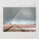 Cartão-postal de um arco-íris e nuvens escuras durante uma tempestade de primavera sobre uma paisagem com um moinho de vento velho e flores cor-de-rosa na região holandesa do Bulbo, com um bar branco esmaecido e o texto "Países Baixos".