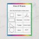 Um postal matemático divertido que pode ser usado para referência rápida que tem a área de fórmulas para quadrados, círculos, retângulos e triângulos contra um fundo do arco-íris!
