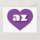 Este cartão-postal apresenta um coração roxo vibrante contendo letras maiúsculas azuis, redondas, brancas e maiúsculas az, uma versão lúdica da abreviação de Arizona, o estado do Grand Canyon. O verso do cartão postal é vazio aguardando seus sentimentos manuscritos ou texto personalizado.