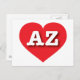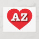 Este cartão-postal apresenta um coração vermelho vibrante contendo as letras maiúsculas brancas em negrito AZ, a abreviação oficial da Arizona, o estado Grand Canyon. O reverso do cartão postal é vazio, aguardando seu texto personalizado ou sentimentos escritos à mão.