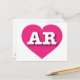 Este cartão tem um coração cor-de-rosa-quente vibrante contendo as letras maiúsculas, brancas e em negrito AR, a abreviação oficial para Arkansas, o estado natural. A placa é vazio de dentro, aguardando seu texto personalizado ou sentimentos manuscritos.
