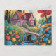 Uma vibrante cena de arte ingênua com uma grande casa presa em colinas rolantes, azul vívido, laranja e flores amarelas florescendo ao fundo, árvores altas em torno de uma graciosa ponte de pedra sobre um riacho fluente, tudo sob um cheio de movimento e cor ao estilo mosaico girando.