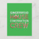 A imagem apresenta as palavras "GINGERBREAD HOUSE CONSTRUCTION TRW" (TRIPULAÇÃO DE CONSTRUÇÃO DA CASA DE GINGERBREAD) escritas num estilo lúdico e decorativo. Cada letra é projetada para se assemelhar a um biscoito de pão de gengibre, completo com detalhes de gelo e elementos decorativos como canas doces e borrachas. O design global é festivo e faz lembrar a época de férias.