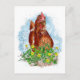 Um frango sentado no trevo e flores desenhado à mão. Bonito presente para sua mãe de frango favorita.