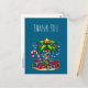 Obrigado cartão postal com uma imagem de feriado sazonal. Uma palmeira tropical decorada em luzes festivas com uma estrela no topo. Uma bengala branca e vermelha gigante que sai da areia. Presentes de Natal debaixo da árvore. Whimsical e divertido.