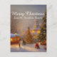 Feliz Natal! Um design nostálgico com árvores de Natal numa pequena vila de neve com pessoas locais se divertindo. Sinta-se à vontade para personalizar a saudação principal e (claro) o seu próprio nome familiar.