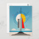 Cette œuvre graphique s'inspire du mouvement Bauhaus avec une composition abstraite géométrique sur fond bleu-vert. Une structure architecturale stylisée s'élève d'une base en escalier noir, soutenant un ensemble harmonieux de formes: un demi-cercle blanc, un segment jaune, une forme rouge triangulaire, et divers éléments linéaires. Les formes nuageuses blanches sur l'horizon créent une dimension spatiale, évoquant un paysage simplifié où les éléments géométriques purs dialoguent en parfait équilibre.
