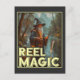 Esta imagem balnear apresenta um feiticeiro parado por um rio numa área florestal, segurando uma vara de pesca com um peixe flutuando em direção à linha. Vestido em trajes de bruxo tradicionais, incluindo um roupão longo e um chapéu pontiagudo, o bruxo lança um feitiço mágico durante a pesca. O fundo, com árvores e montanhas, cria uma atmosfera mística e serena. O texto "REEL MAGIC" exibido com destaque na parte inferior da imagem, adiciona um toque humorístico e mágico à cena.