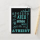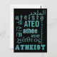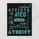 Ateus globais, um Design de texto negrito com ATEUS em muitos idiomas: athée, ἄ θ ε, ateo, ا ل م ل ح د, ateista, 무, ateist e Godloochenaar.
