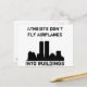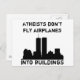 Imagem das torres gêmeas do centro de comércio mundial antes do ataque em 11 de setembro (911 nove onze 9 11) com a legenda "ateus não pilotam aviões em construções. No dia 11 de setembro, o centro de comércio mundial foi destruído sem escrúpulos. Não por um governo ou cientista louco ou mesmo alguém com motivações financeiras. Foi destruída por um grupo religioso fundamentalista. Nove Onze foi uma iniciativa baseada na fé. Muçulmanos islâmicos fundamentalistas assassinaram milhares de cidadãos americanos a sangue frio em nome de Deus. Engraçado que os ateus sejam a minoria menos confiável. Especialmente quando se considera que os ateus não levam aviões a construções.