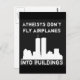 Imagem das torres gêmeas do centro mundial de comércio antes do ataque de onze de setembro (11 de setembro, 911) com a legenda "ateus não voam com aviões contra prédios. Em onze de setembro, o centro mundial de comércio foi destruído impiedosamente. Não por um governo ou um cientista louco ou mesmo alguém com motivações financeiras. Foi destruído por um grupo religioso fundamentalista. O Onze de Setembro foi uma iniciativa baseada na fé. Muçulmanos islâmicos fundamentalistas assassinaram milhares de cidadãos americanos a sangue frio em nome de Deus. É engraçado, então, que ateus sejam a minoria menos confiável da nação. Principalmente quando se considera que ateus não voam com aviões contra prédios.