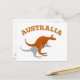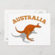 Um canguru marrom, sorrindo, saltando, lançando uma sombra debaixo dele. A palavra Austrália está escrita num bronzeado/marrom sobre o animal.
