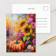 Uma pintura abstrato vibrante e moderna que mostra um arranjo lúdico de abóboras, girassóis e outras folhagens de outono. Matizes ricas do outono como laranja queimado, vermelhos profundos, pinks e amarelos ouros se misturam com pinceladas macios e tons negros de cor. O estilo abstrato adiciona um talento contemporâneo ao tema tradicional da colheita de outono, capturando o calor e a beleza da estação em uma composição artística viva.