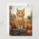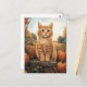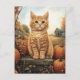 Pintura química de um gatinho laranja esnobado sentado entre abóboras numa fazenda rústica no outono.