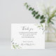 Folhas verdes rústicas e deliciosas pintadas em delicada paleta de verduras aquáticas e cinzentos para este elegante e clássico obrigado de casamento que você postcard. Use a modelo para adicionar seus detalhes. No mesmo design, você pode encontrar Cartões de Convite, Cartões de Informação, Cartões de menu, Números de tabela, Plano de mesa, Cartões de posição, sinal de boas-vindas e muito mais! Portanto, podem ter a certeza de que o tema será consistente do princípio ao fim. A fonte e a cor podem ser facilmente alteradas para ajustado de sua necessidade, para obter ajuda ou solicitação personalizada, escreva em citronelladesign@gmail.com ou entre em contato conosco através da loja