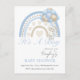 Um roteiro doce de "É um Menino" em cor azul pastel com arco-íris de cor aquática e coelho coelho pequeno com balões orçando convite para bebês. Só adorável e perfeito para o seu chá.