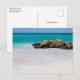 Um postal com uma bela fotografia. Uma praia branca arenosa, com um surf gentil. A água turquesa tropical rodeia uma rocha agitada.