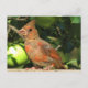 Este cartão-postal apresenta um adorável Cardeal Norte para bebês. Ele é todo ouro e marrom com um bico bronzeado agora, mas quando suas penas adultas crescerem, ele será um pássaro vermelho brilhante com um bico de laranja. Ele está sentado num trilho em frente a uma árvore cheio de maçãs verdes parecendo um pouco confuso.