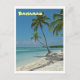Este cartão de posto apresenta uma foto de palmeiras altas que se inclinam sobre a clara água azul e areia branca de uma ilha das Bahamas. Paraíso numa fotografia.