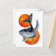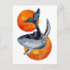 tradicional aquarela pintando uma grande baleia azul mergulhando em frente a duas bolas de ouro surreais em um cartão postal.
