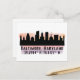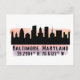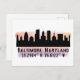 Carteira postal apresenta a silhueta de linha do horizonte da cidade de Baltimore, Maryland, com abertura de cor d'água e coordenadas de latitude e longitude