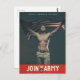 Estilo retrô, branco vermelho e azul, poster de recrutamento do exército dos Estados Unidos com um oficial dos Estados Unidos segurando estrelas e listras balançando a bandeira acima de sua cabeça