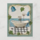 © Silvia Vassileva/Maçã selvagem. Uma banheira branca no chão do azulejo. A parede do banheiro é branca e azul.