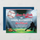 Este divertido e esportivo Bar de Baseball Mitzvah Salve o cartão Data pode ser usado como cartão postal ou como um cartão com envelope excluindo os itens na parte traseira do cartão que você não precisa. Este único Bar do tema Baseball Mitzvah salvou o cartão de data com um estádio de campo de bola noturna com um diamante verde e marrom de baseball com luzes brilhantes brilhando na silhueta negra de um jogador de beisebol se curvando para pegar uma bola no chão. Um beisebol branco e vermelho com uma estrela judia azul-clara de David está no canto superior esquerdo com um esportivo vermelho e branco olhando Salvar o texto Data para a direita da bola com uma cauda que cai sob a palavra Data. O verso deste Bar de baseball Mitzvah, que salva o cartão de data, é feito em vermelho e azul com outra silhueta de jogador de baseball na placa de casa, pronta para jogar. Exclua a caixa de carimbo de correio e as linhas e o endereço de devolução, usando a tela design quando usar a opção EDIT FOUTHER azul. Em seguida, selecione as linhas e use o botão de exclusão ou deixe-o como está para sair como cartão postal.