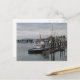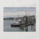 Uma barcaça lindamente restaurada amarra no cais público em La Conner, Washington, numa tarde parada e nublada do Pacífico Noroeste.