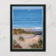 Uma vista sobre as dunas até o mar, com um barco de pesca no horizonte.