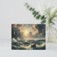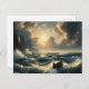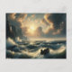 Ondas oceânicas dramáticas e turbulentas se abrem sob um céu brilhante e cheio de nuvens enquanto dois indivíduos remam um pequeno barco através das águas ásperas. Clipes se erguem ao fundo, e pássaros podem ser vistos voando contra o pano de fundo do sol.