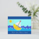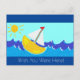 Ilustração digital de um barco amarelo numa onda oceânica. O iate tem velas brancas e uma bandeira vermelha. O sol amarelo brilha. A mensagem diz: "Queria que você estivesse aqui!" Personalize facilmente este cartão editando o texto do modelo. Obrigados para ver as minhas designs.
