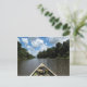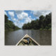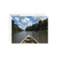 Um barco afunda um rio na selva amazônica sob nuvens inchadas em um céu azul.