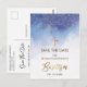 Batismo Elegante Salve O Cartão-Postal De Data. Design com fundo azul de aquarela e elementos de ouro na frente com cruz de ouro e batismo em formato de folha de ouro. Adicione mais detalhes na parte traseira do cartão postal. Para editar este modelo, clique em personalizar mais. (não serão utilizadas folhas de alumínio verdadeiras).