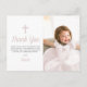 Agradeça à sua família e amigos por terem comparecido ao batizado da sua filha com uma foto da sua criança. O design rosa apresenta bolinhas brancas em um fundo de aquarela rosa no verso do cartão. Todo o texto pode ser personalizado, incluindo o nome da criança e a mensagem.