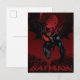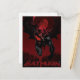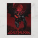 Este poderoso gráfico ilustra Batman em uma pose dinâmica de ação, saltando contra um pano de fundo de uma lua vermelha de sangue e um horizonte tempestuoso de Gotham. A ilustração está mergulhada em tons de vermelho e preto, enfatizando a intensidade e o perigo do momento. Batman é representado em movimento de cheio, batendo o gancho na mão, pronto para enfrentar os perigos que espreitam à noite. A cidade abaixo dele é reproduzida em um estilo detalhado de wireframe, sugerindo sua complexidade e profundidade de segredos que guarda. A chuva bate em toda a cena, aumentando a tensão dramática e o sentimento de uma batalha de alto risco contra o crime. O trabalho de arte transmite o ímpeto implacável de Batman e o seu papel de herói negro numa cidade que nunca dorme, capturando a sua essência como guardião e protetor silenciosos de Gotham.