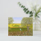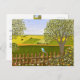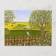 A card with a beautiful image of a nature scene: A bird sitting on a weathered fence, wildflowers growing around the fence, a farmer on a tractor, working his land, trees with leaves, and farmland with various colors. Original artwork by W.B.