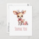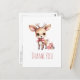 Cartão de agradecimento com ilustração de um adorável bebê veado. Olhos grandes orelhas grandes com uma cabeça grande e pequenos chifres marrons. Usando um grande laço vermelho. De pé ao lado de uma pilha de presentes.