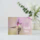 Lindo cartão postal de agradecimento apresentando um beija-flor anna's rosa voando contra um fundo roxo e verde, olhando para cima e posando com as asas estendidas alegremente. Ao lado dele "Obrigado" está escrito em tipografia branca moderna. Belo cartão de agradecimento para amantes de pássaros, jardins e natureza. Foto tirada em Arcadia, Califórnia.