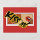 O pop art design apresenta uma camada de texto do Kiss Me no rosto da mulher. Fundo vermelho