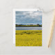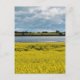 Um campo de canola amarela vibrante floresce sob um céu dinâmico, com manchas de nuvens fluffy lançando sombras na paisagem. Ao fundo, uma banda contrastante de árvores verdes escuras separa o campo de uma extensão tranquila de água. Esta imagem foi tirada perto de Streatham em Victoria, Austrália.