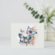 Um cartão postal com um trio de borboletas a esvoaçar entre algumas flores bonitas. Esquema de cores azul rosa e verde.