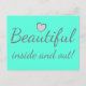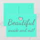 Este é um belo cartão postal cor de turquesa para ela com um impressão de coração prateado que diz 'Belo dentro e fora!' impresso em letras cursivas bonitas de prata.