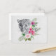 Um cartão postal com uma bela ilustração apresentando um retrato de leopardo cinza, preto e branco. Este lindo animal é cercado por um buquê de flores tropicais. Elegante, exótico e adorável.