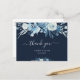 Um cartão postal adorável para enviar mensagens de obrigado aos seus convidados de casamento. Tem flores de aquarela azul e branca e fontes de script branco na frente. Você pode editar o texto e as cores.