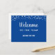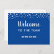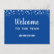 Bem-vindo à equipe com texto personalizável. Confetti círculos e estrelas no topo. Altere o fundo azul para outra cor, se desejar. Bem-vindo a novos membros ou funcionários com um cartão postal divertido.
