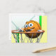 Um presente de excelente para um fã de basquete. Uma engraçada bola de basquete laranja cai através de um aro de basquete com um grande sorriso.